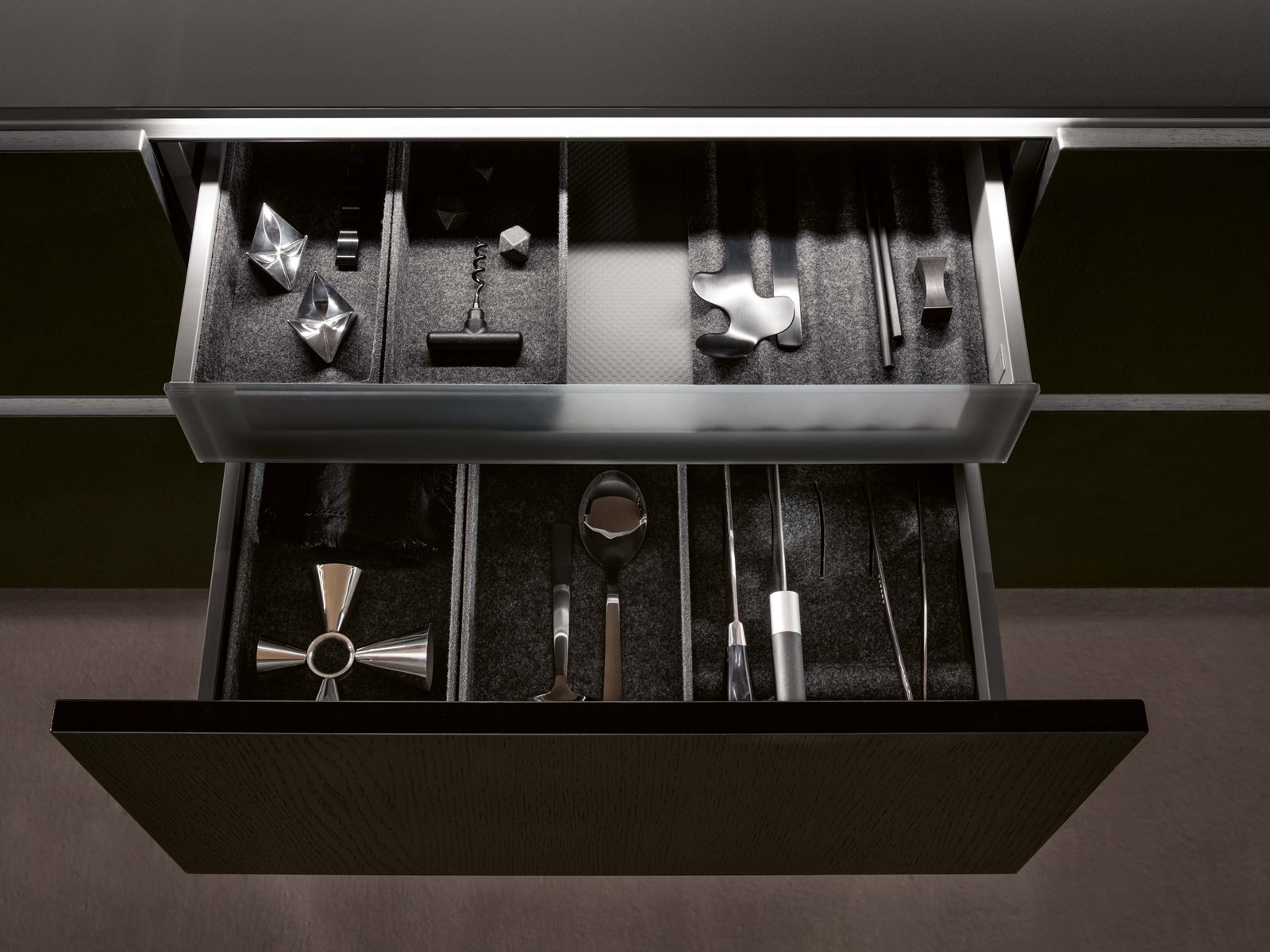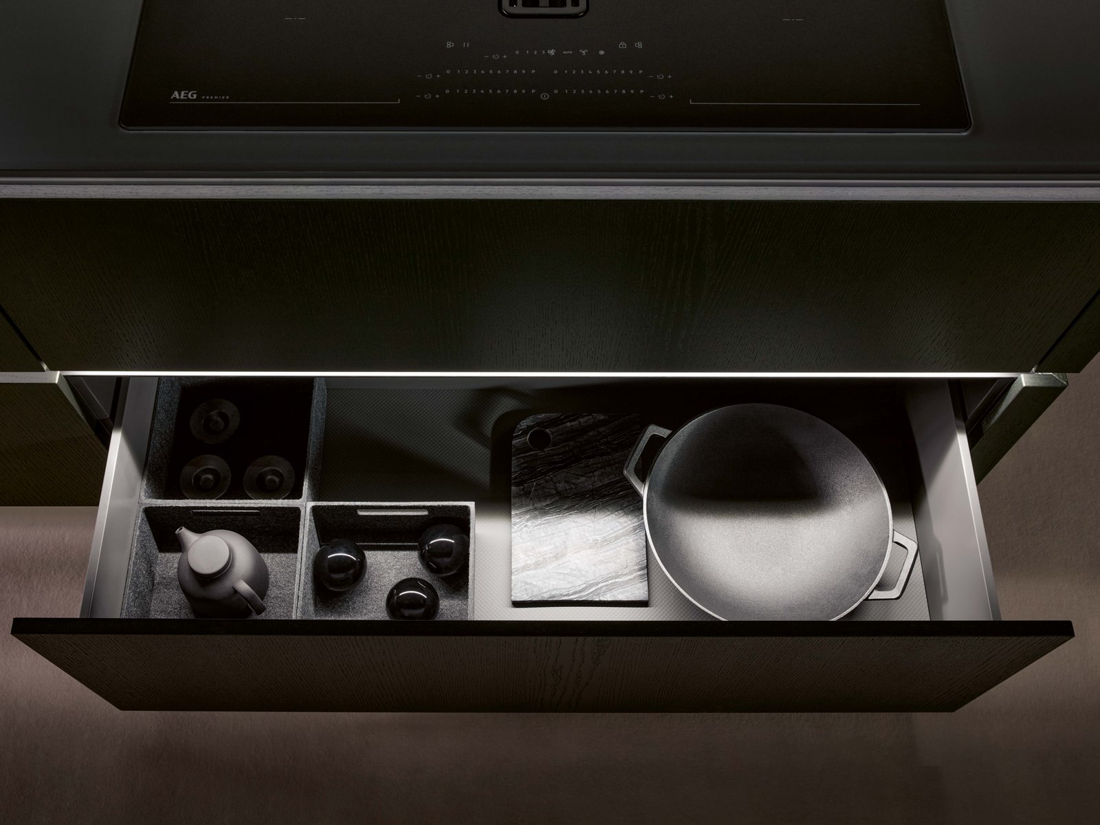 Für stets optimale Ausleuchtung in Schubkästen und Auszügen bietet LumiQ intelligente Lösungen. Digitale LED-Länder in der Griffmulde, leuchten dank des verbauten Sensors automatisch im Bereich des geöffneten Auszuges und verschaffen so den perfekten Überblick. Eine verbaute Lichtoptik beleuchtet auch in der Tiefe den vollen Auszug oder Schubkasten.