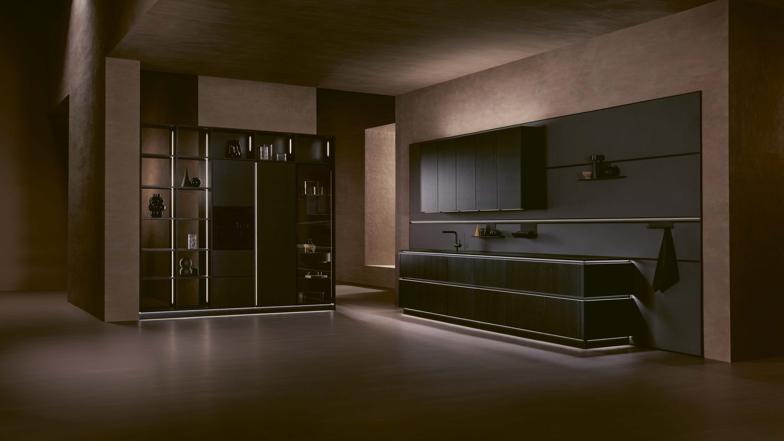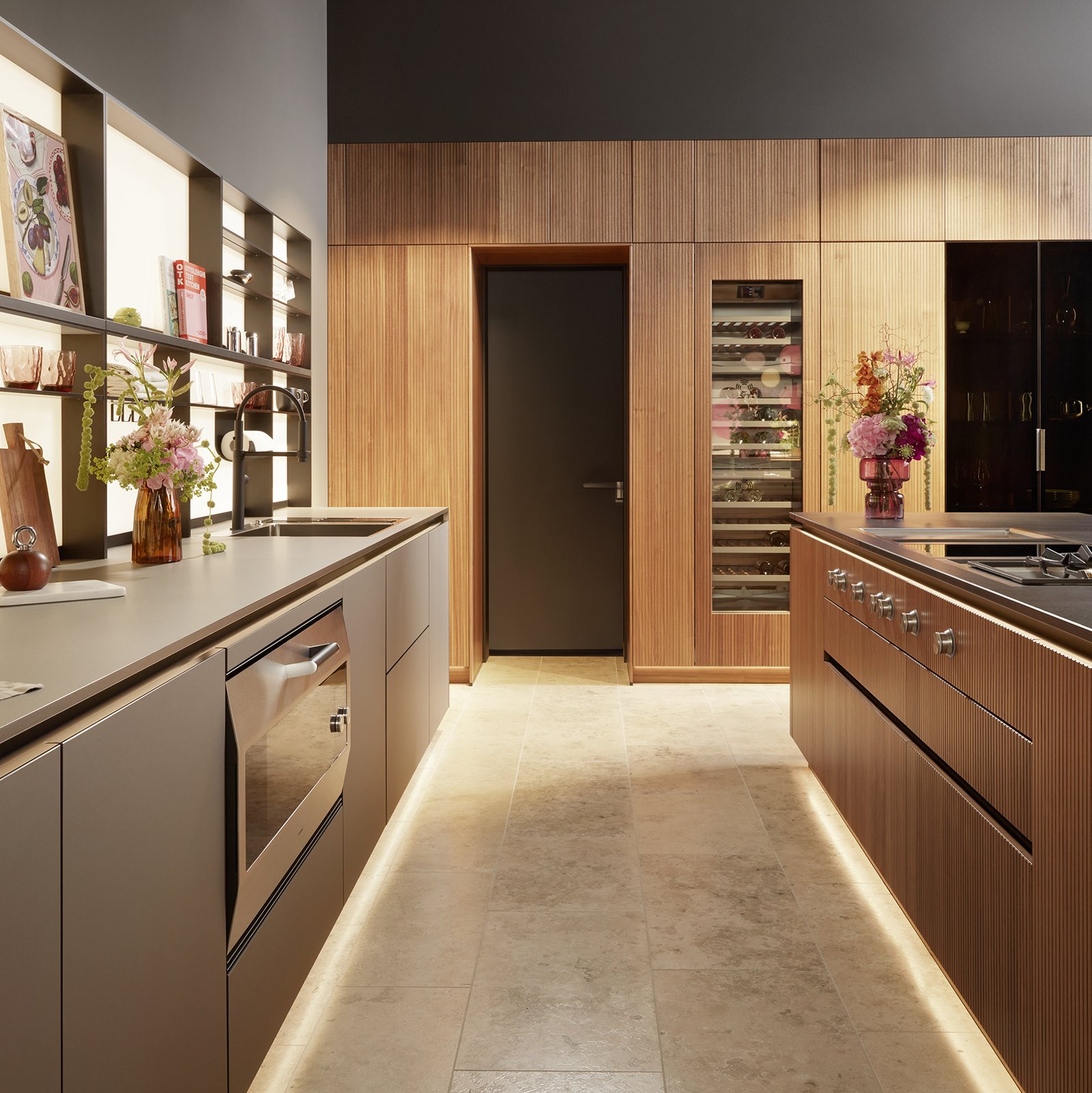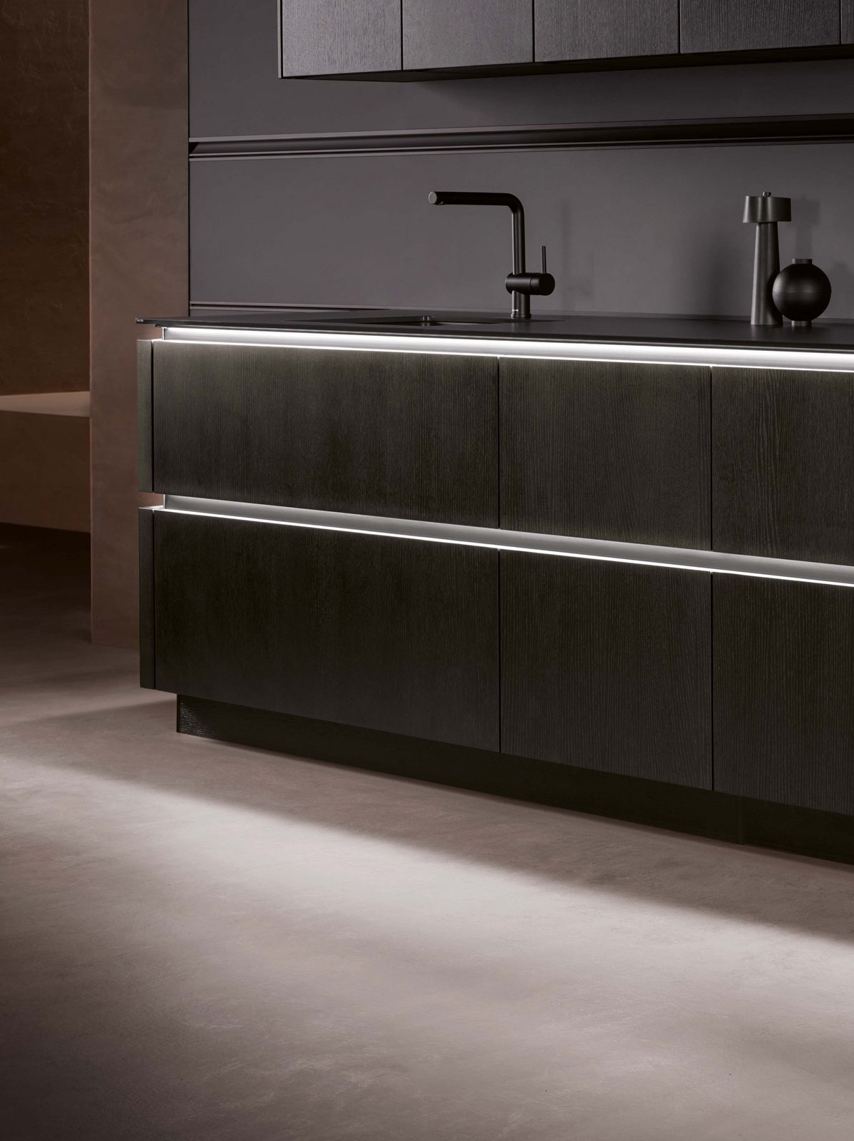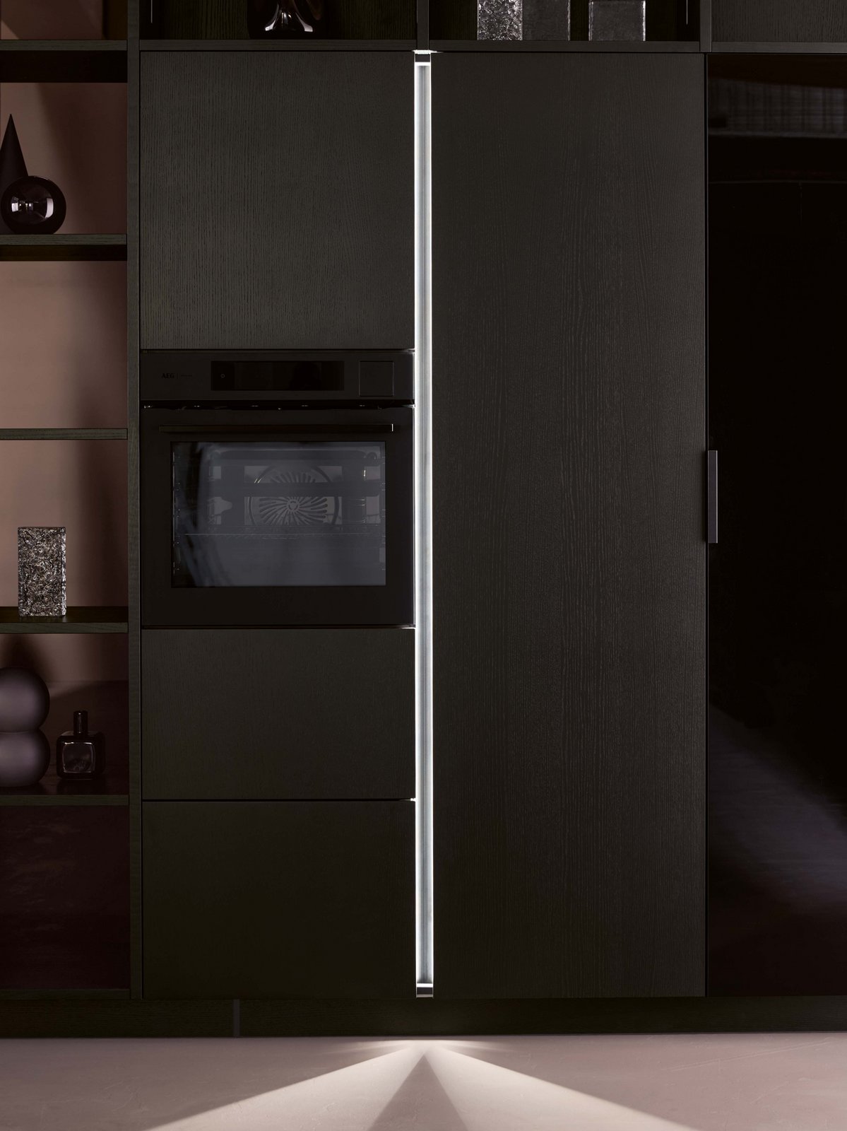 Elegante Lichtstimmung in der Küche entsteht besonders durch die Kombination aus vertikalen und horizontalen Lichtspuren. Erstmals in der Küchenbranche lassen sich mit LumiQ nun vertikale Griffmulden mit einer Lichttasche hinter hoch eingebauten Geräten elegant beleuchten.
