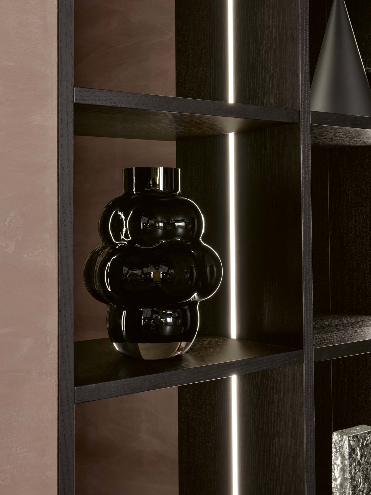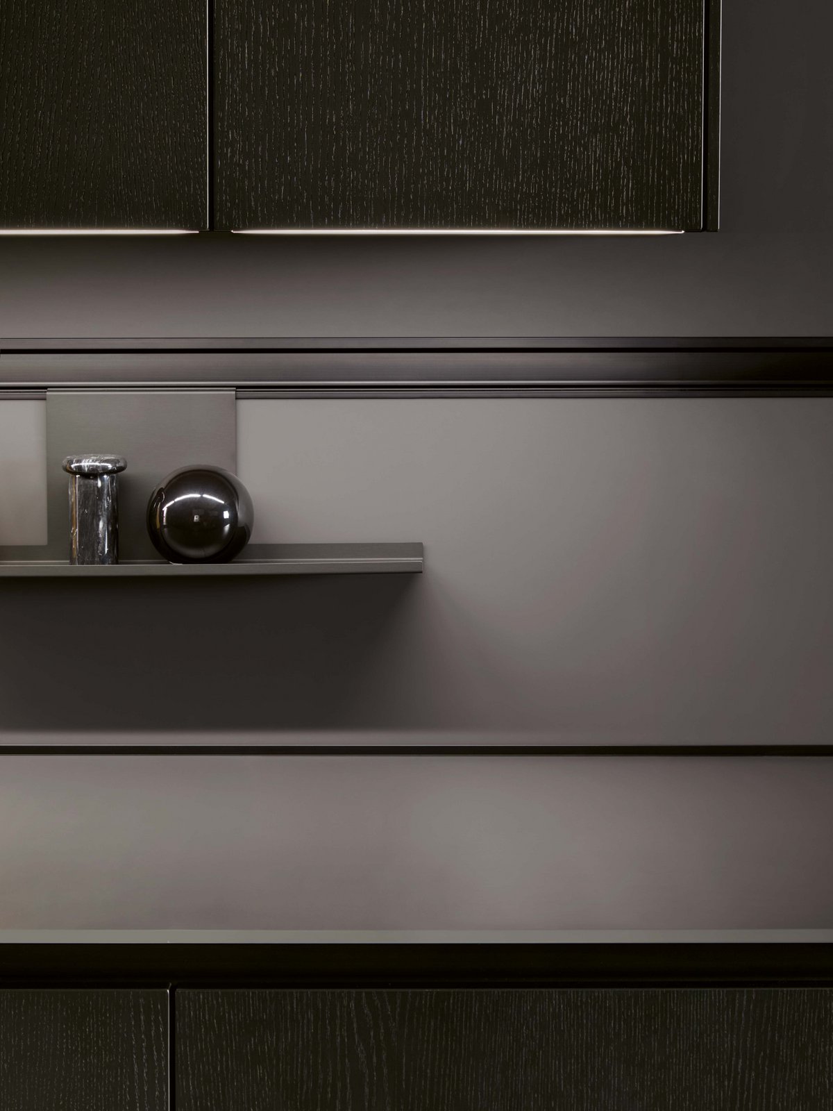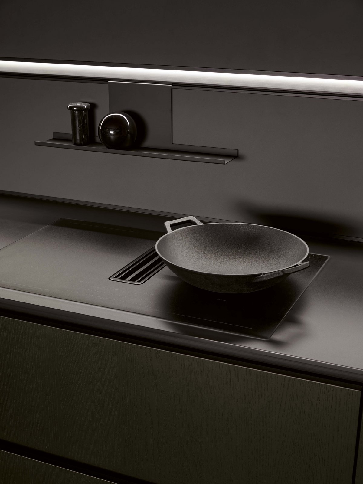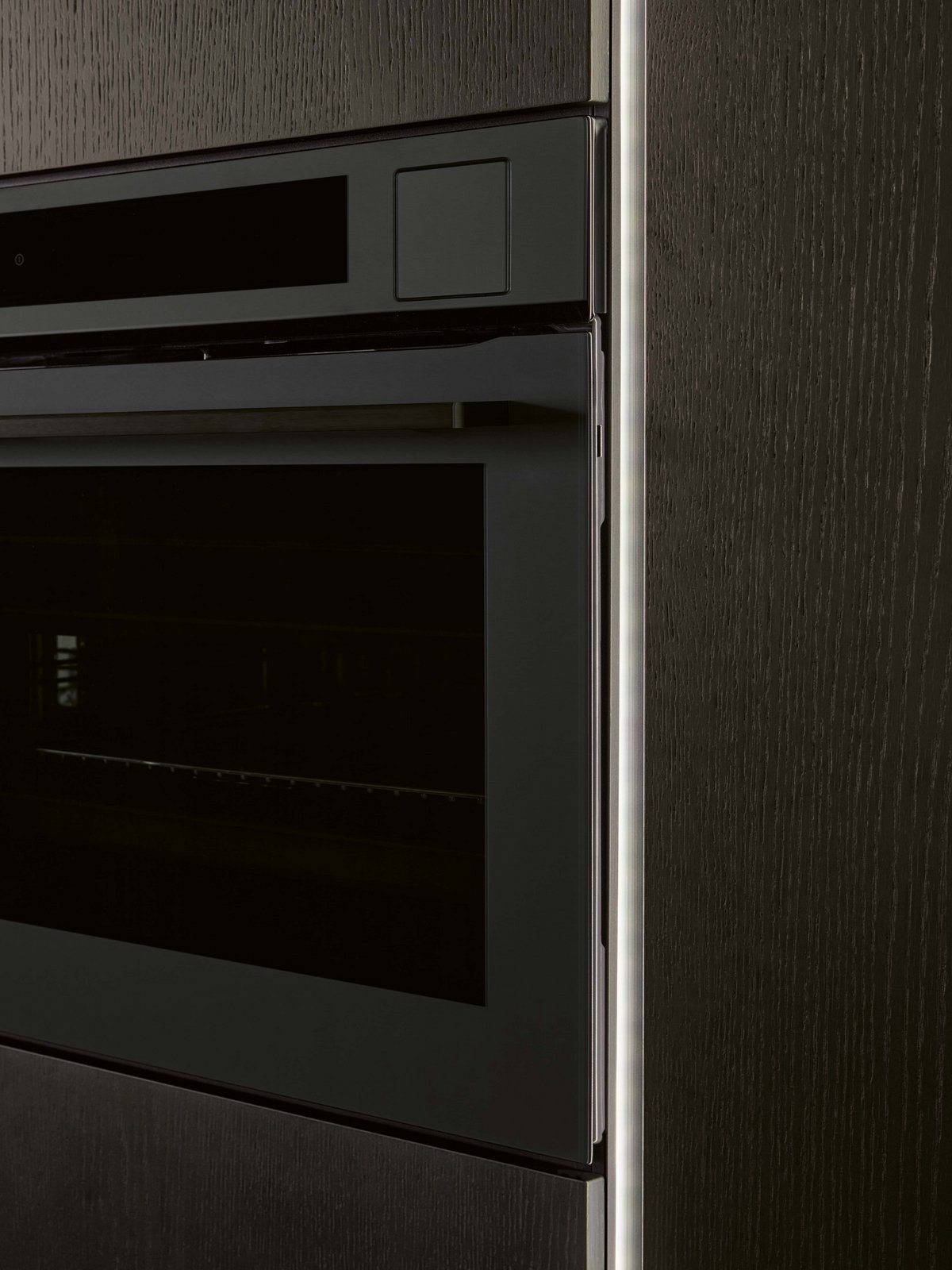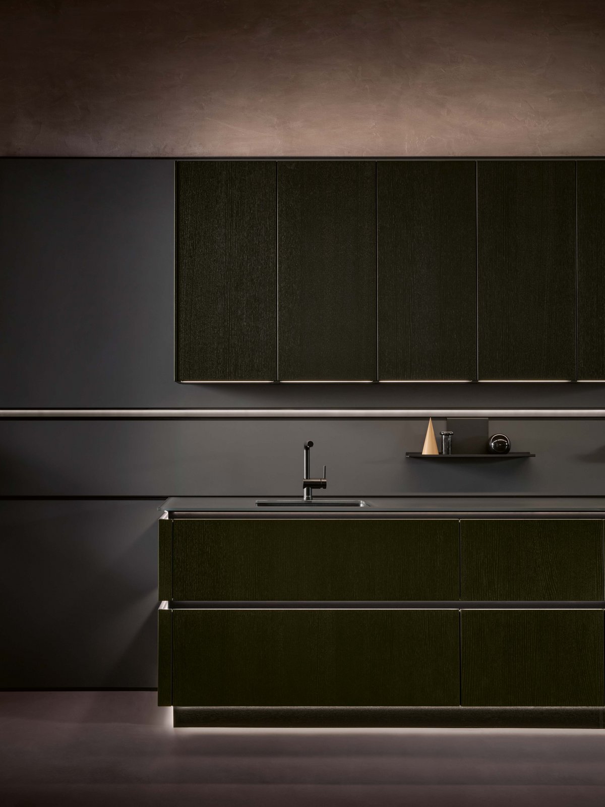 Elegante Lichtstimmung in der Küche entsteht besonders durch die Kombination aus vertikalen und horizontalen Lichtspuren. Erstmals in der Küchenbranche lassen sich mit LumiQ nun vertikale Griffmulden mit einer Lichttasche hinter hoch eingebauten Geräten elegant beleuchten.