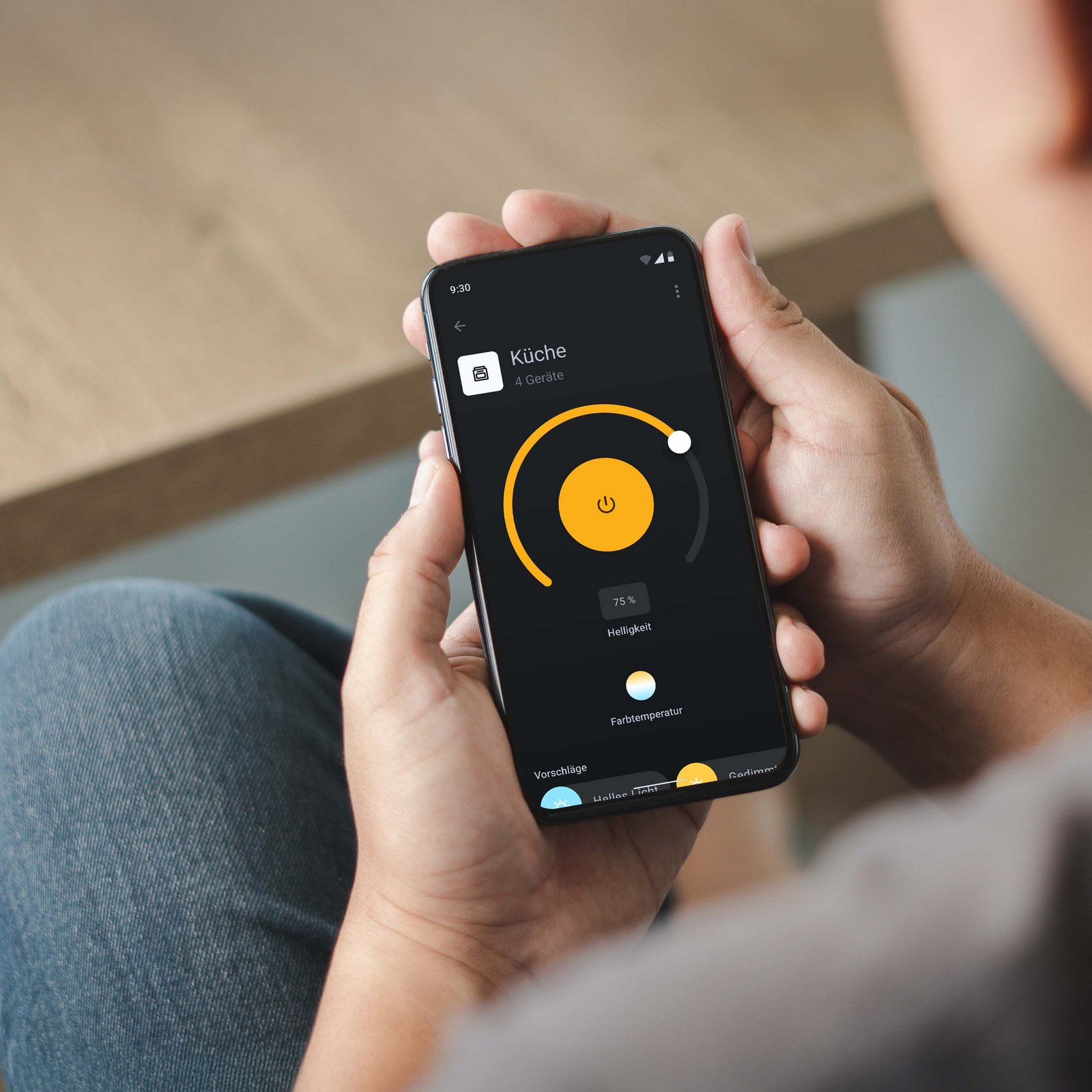 Mit Hilfe einer App können alle verbauten LumiQ Leuchten einzeln angesteuert, gedimmt, gruppiert und in der Lichtfarbe angepasst werden. Gleichzeitig können individuelle Beleuchtungsszenarien und Routinen für bestimmte Tageszeiten oder Anlässe eingestellt und abgespeichert werden. Ob entspannter Abend oder funktionale Arbeitsbeleuchtung beim Kochen – in wenigen Sekunden stets die richtige Beleuchtung.