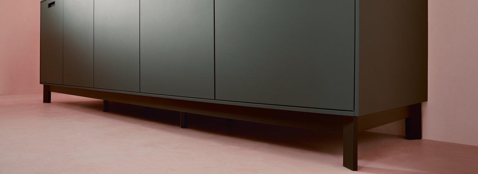 Um die filigrane Anmutung zu erreichen, wird das Inselgestell bewusst in Onyxschwarz gehalten und nimmt sich so optisch zurück. Das Inselgestell wird für Schrankkombinationen von 100 cm bis 320 cm Breite angeboten. Mögliche Tiefen der Schrankkombinationen von 90 cm bis 120 cm.