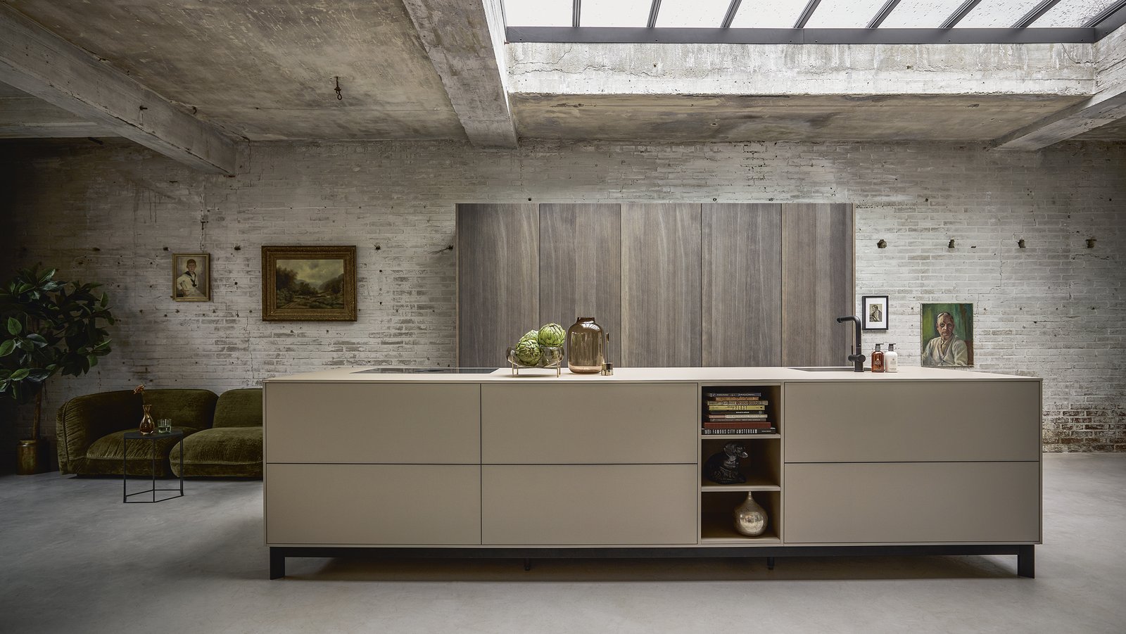 Die unifarbene Kochinsel scheint auf ihren Füßen beinahe zu schweben. In ihrer grifflosen Ausführung und den großzügigen Dimensionen wirkt sie wie ein minimalistisches Objekt. Dahinter befindet sich ein mit Falttüren zu öffnender Schrank, der die Technik und seinen Inhalt geschickt versteckt und bei geschlossener Front angenehme Ruhe in den Raum bringt.