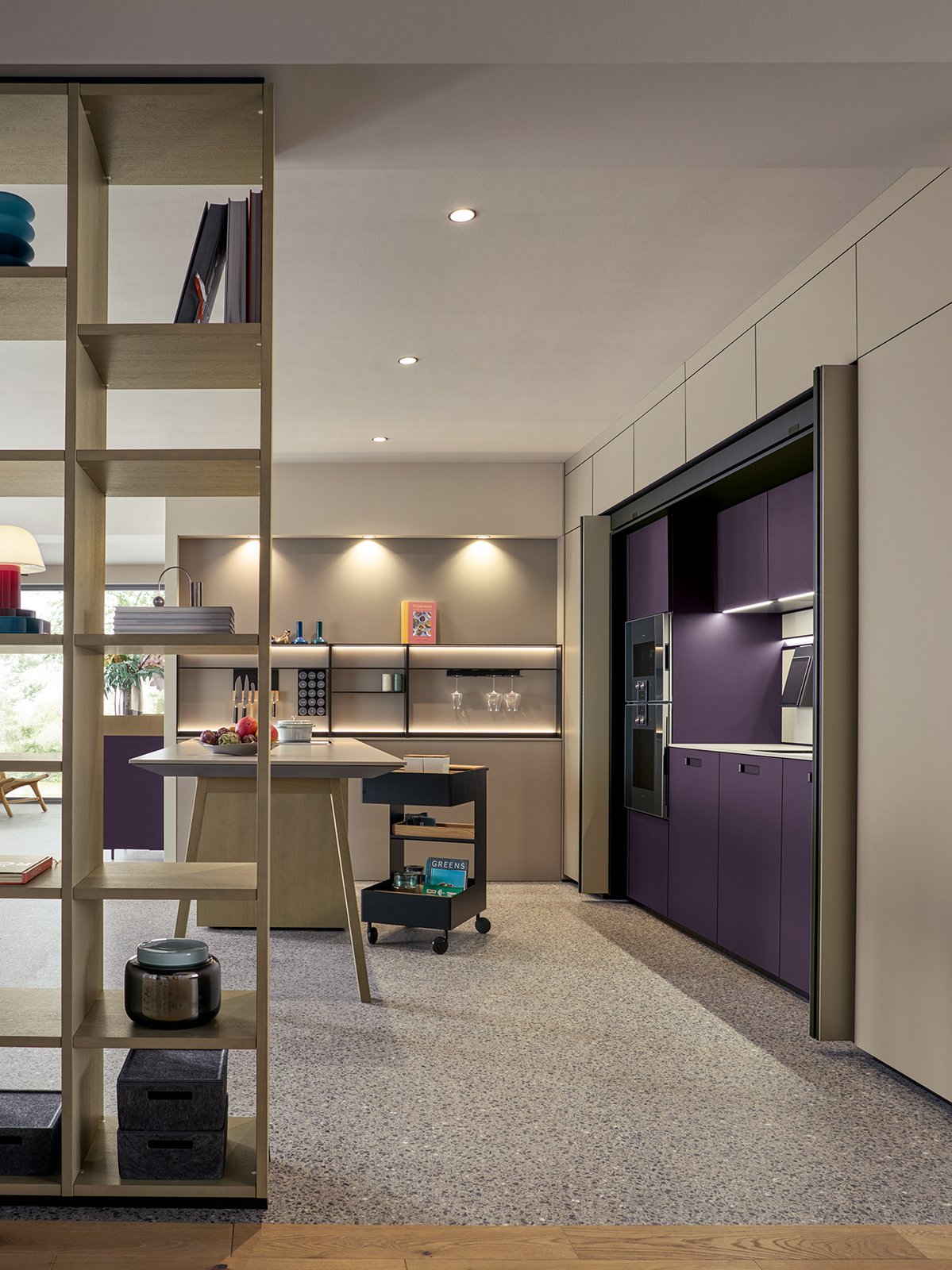 Ein kontrastreicher Akzent entsteht durch die fingerabdruckresistenten Samtmatt-Lackfronten in Aubergine, die sich stilvoll mit dem Sideboard verbinden. Dazwischen sorgt ein indirekt beleuchtetes Nischenregal für eine harmonische Verbindung von Funktionalität und Design.