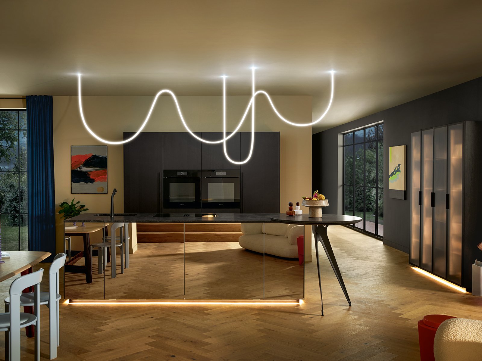 Im Hintergrund sorgt die Hochschrankzeile mit Küchenfronten in Eichenfurnier onyxschwarz für eine harmonische Verbindung von Funktion und Zurückhaltung. Sie fügt sich nahtlos in das ganzheitliche Lichtkonzept der Küche ein: Ob Sockel, Griffmulden oder Innenschübe – jedes Detail kann stilvoll beleuchtet werden.