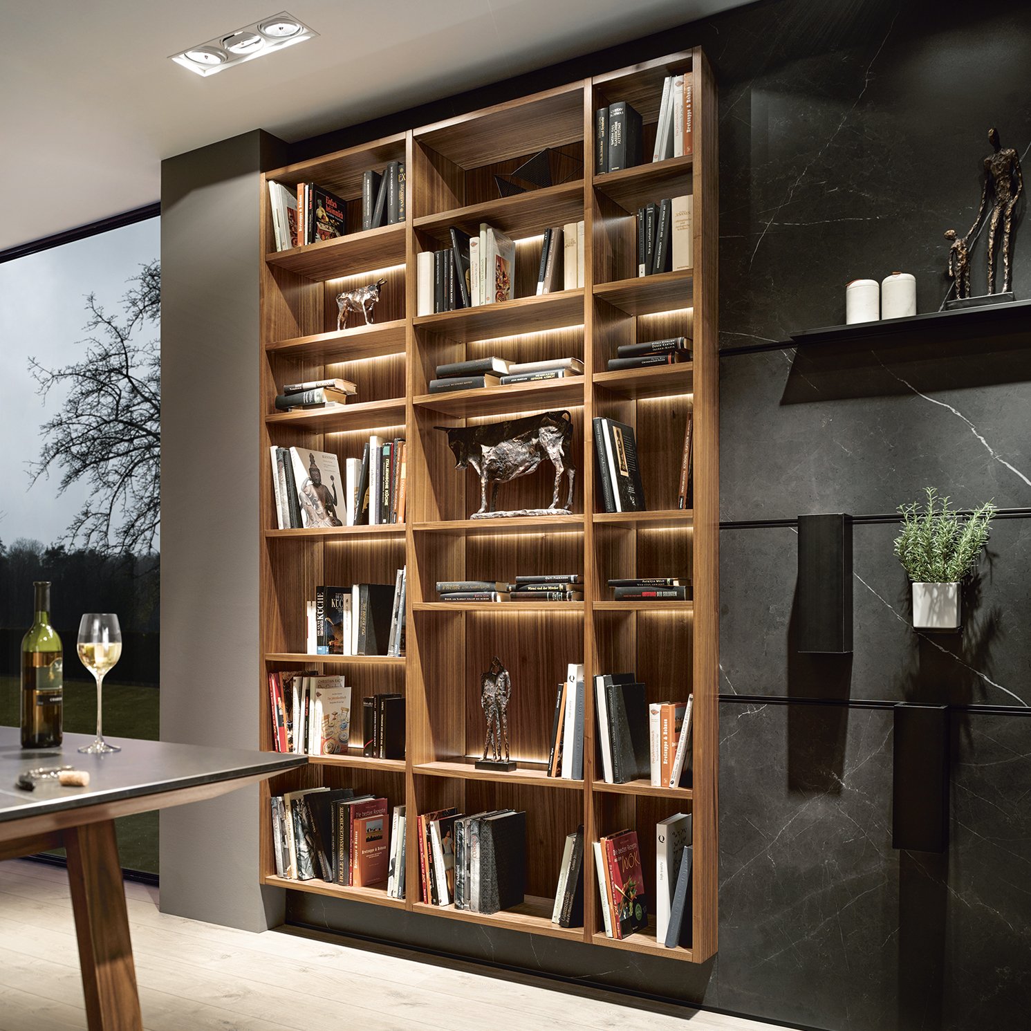Aujourd’hui, la cuisine conquiert de plus en plus l’espace de vie et a quitté l’étroitesse de ses quatre murs. Quoi de plus naturel que de suivre cette tendance et de transformer des espaces fonctionnels en lieux de vie. Le concept ouvert ainsi que certains meubles apportent de la convivialité, comme par exemple la nouvelle table d’appoint ou la table de cuisson, qui s’intègrent parfaitement dans chaque environnement et impliquent l’invité dans l’action, le système next125 Système à galandage qui fait disparaître la cuisine derrière de grandes portes, ou l’îlot sur pieds qui semble presque flotter.