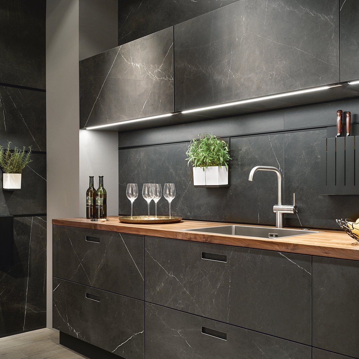Si la transition des fonctions de la cuisine - travail et plaisir - est fluide, alors la lumière peut influer positivement sur l'ambiance. Une lumière à effet ou de travail, merveilleusement lumineuse ou, selon l'ambiance souhaitée, variable : dans les espaces de vie et surtout dans la cuisine, la lumière joue un rôle différent pour chacun d’entre nous. D’autant mieux qu’il existe la solution adaptée à toutes les préférences : des lampes suspendues aux LED placées au-dessus du plan de travail en passant par l’éclairage à l’intérieur des armoires, pratiquement tout est possible.