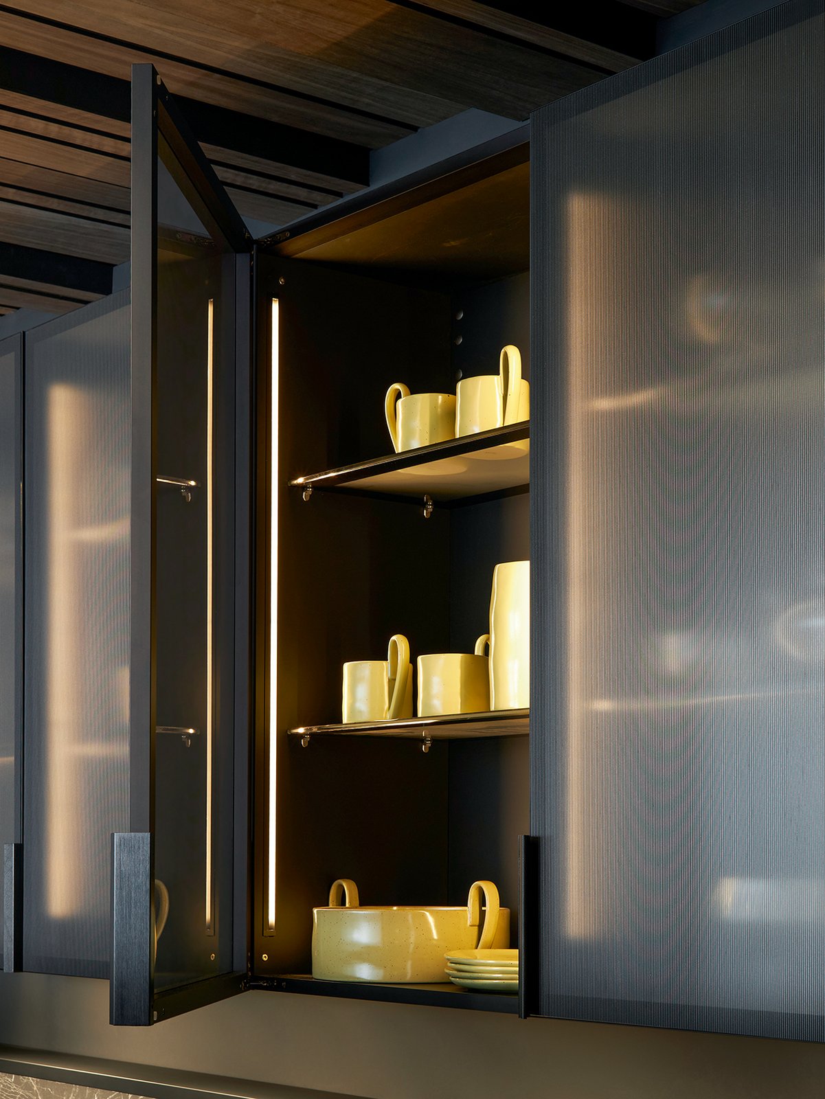 Les tablettes lumineuses intégrées dans l’élément haut illumine parfaitement le plan de travail et crée en plus une ambiance lumineuse émotionnelle dans toute la pièce.