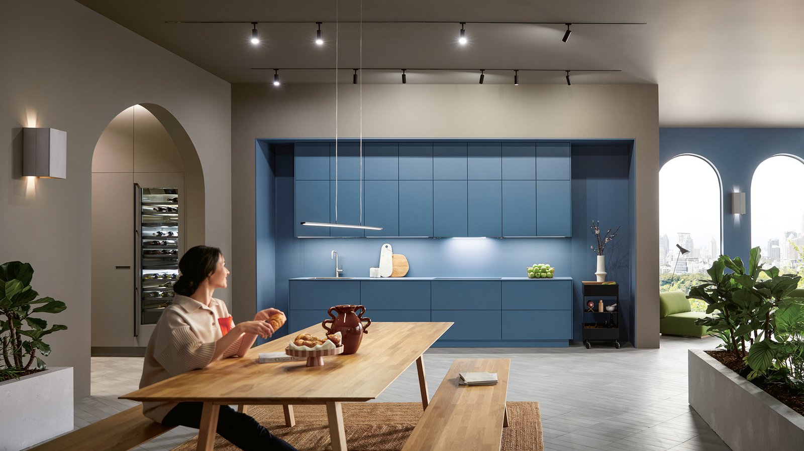 Si la transition des fonctions de la cuisine - travail et plaisir - est fluide, alors la lumière peut influer positivement sur l'ambiance.
