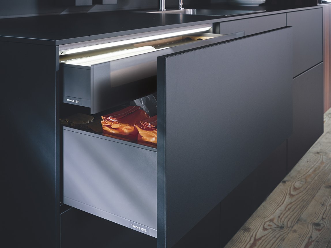 Une poignée profilée à LED souligne discrètement et élégamment l’aspect minimaliste de la cuisine et la met habilement en scène. L’éclairage à effet crée une belle lumière indirecte. Il fait sensation, même quand on ne travaille pas dans la cuisine.