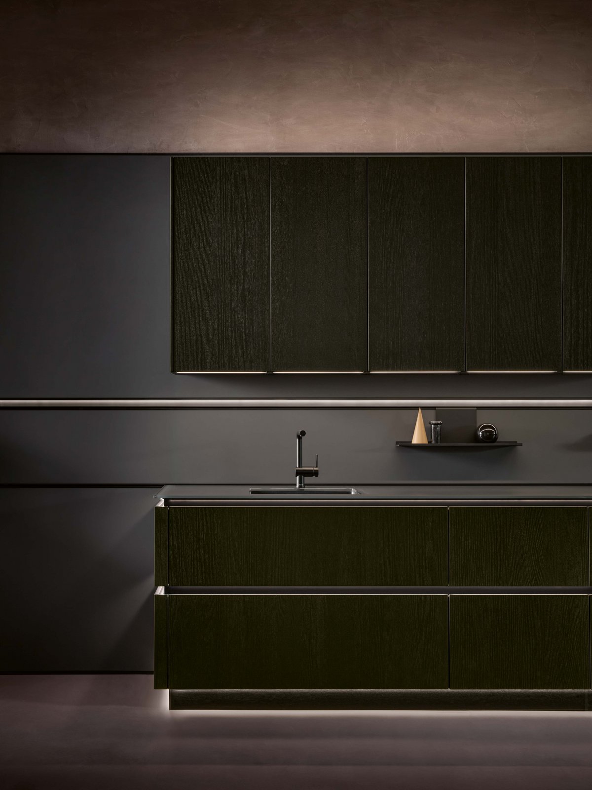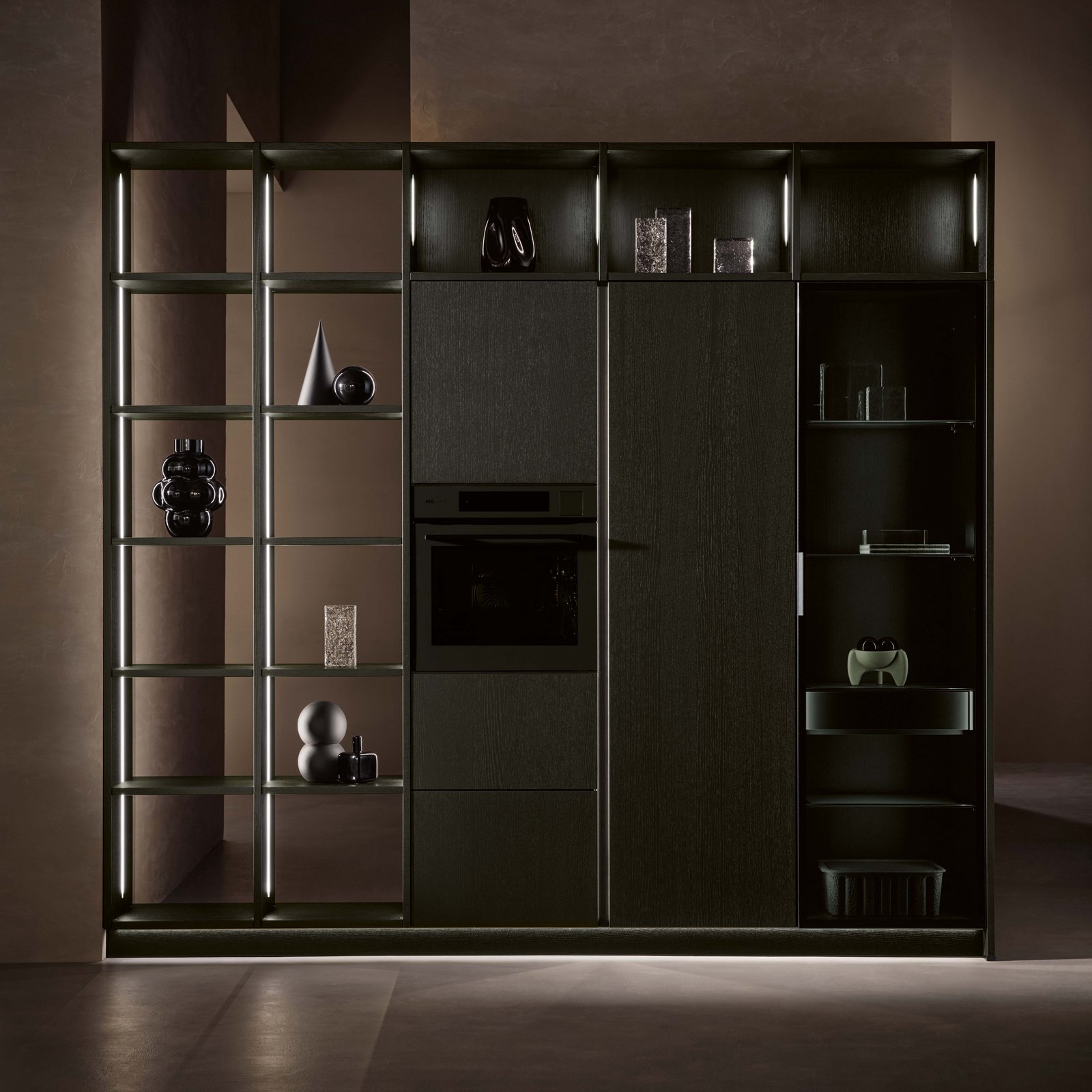 L’élégance de l’éclairage dans la cuisine résulte notamment de la combinaison de rayons verticaux et horizontaux. Pour la première fois dans le secteur de la cuisine, avec LumiQ, les poignées gorge verticales peuvent être élégamment éclairées grâce à une poche lumineuse placée derrière les appareils encastrés en hauteur.
