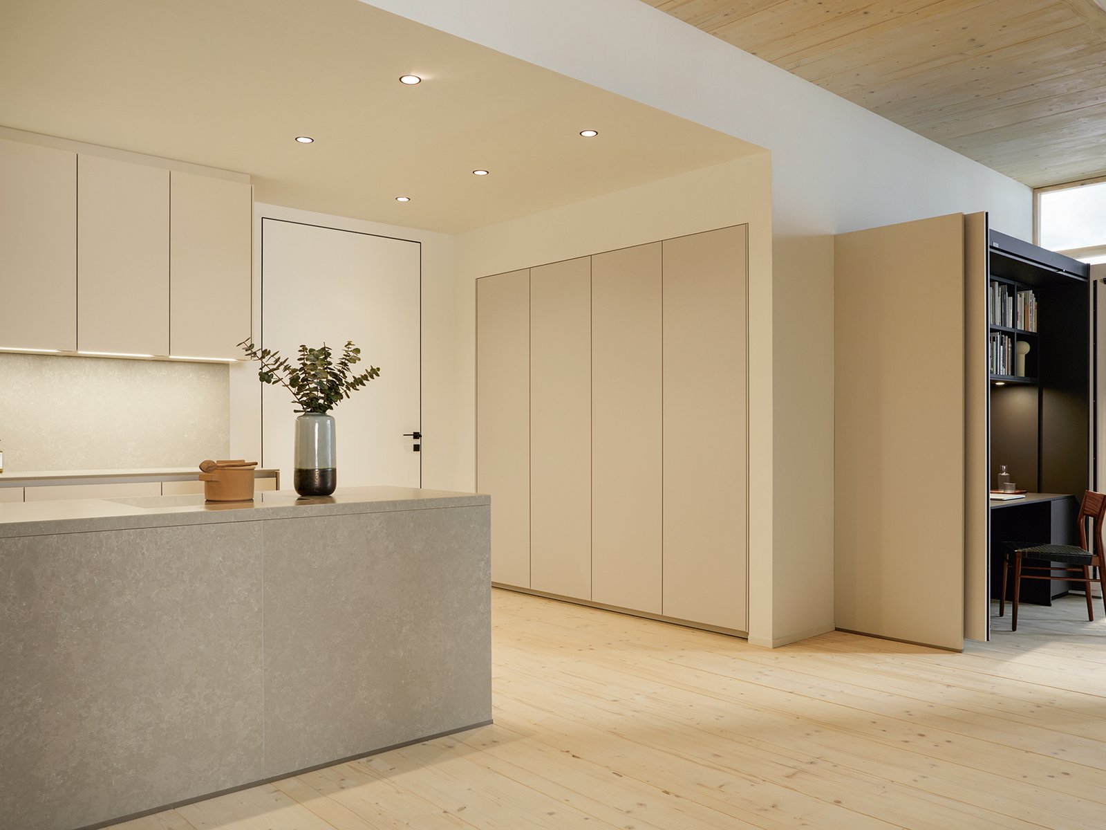 La cuisine est un domaine passionnant lorsqu’il s’agit du langage des formes. Prenons par exemple la hauteur de caisson extra haute de 87,5 cm, combinée à une plinthe particulièrement basse et à l’absence de poignées – et voilà – le rêve cubique de tous les puristes est né !