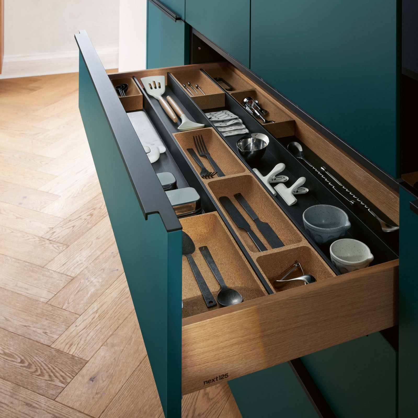 Les matériaux haut de gamme et robustes confèrent un aspect moderne : les supports à épices et les inserts multifonctions en liège, les supports pour couvercles, casseroles ou assiettes en panneaux de fibre de bois à haute densité sont tout aussi convaincants que les séparateurs de rangement ou les blocs à couteaux, qui combinent les deux matériaux.