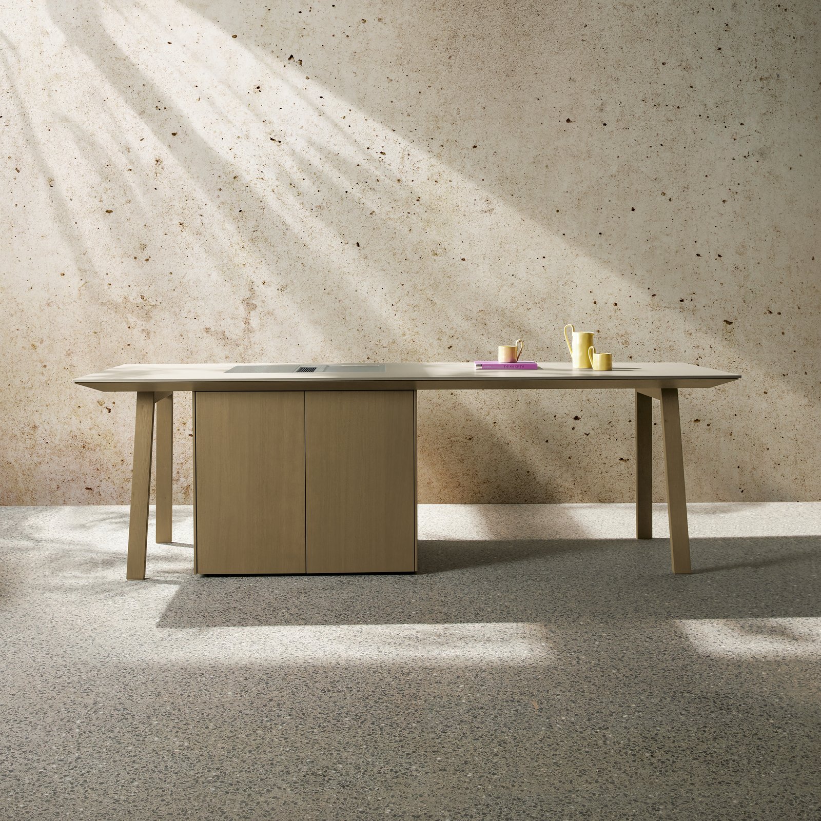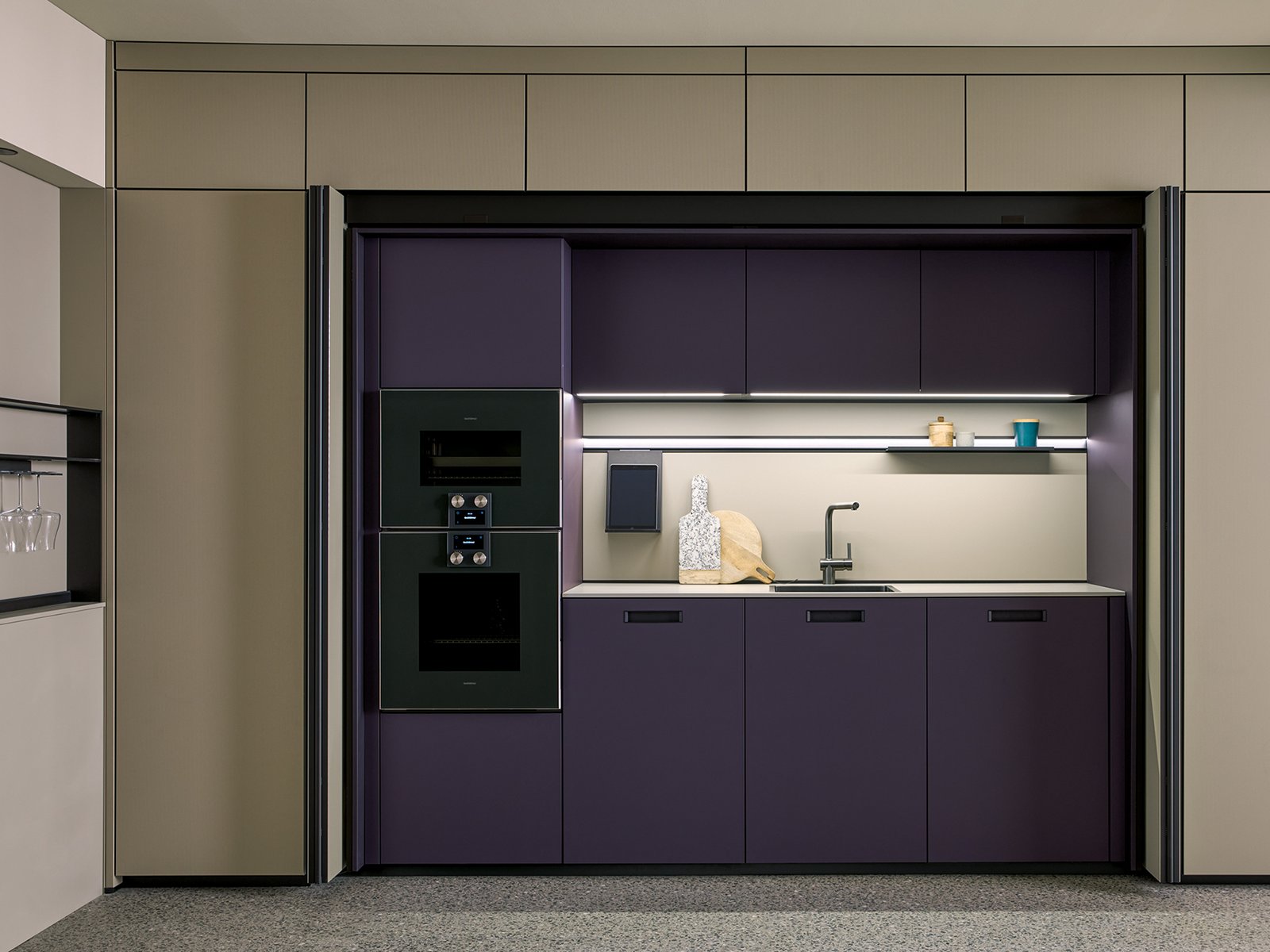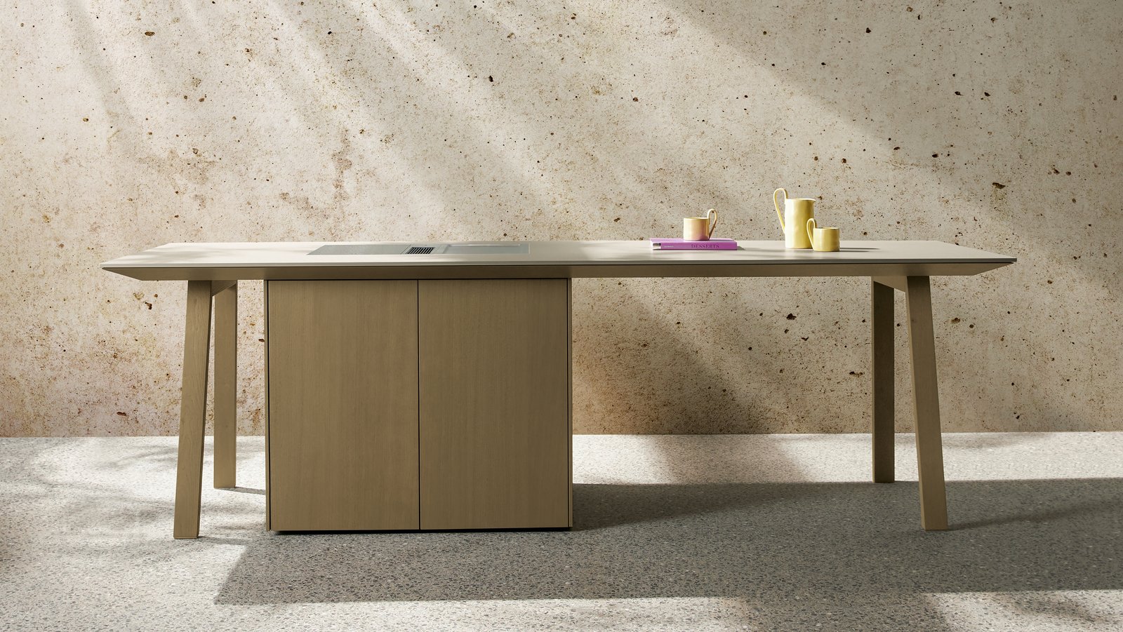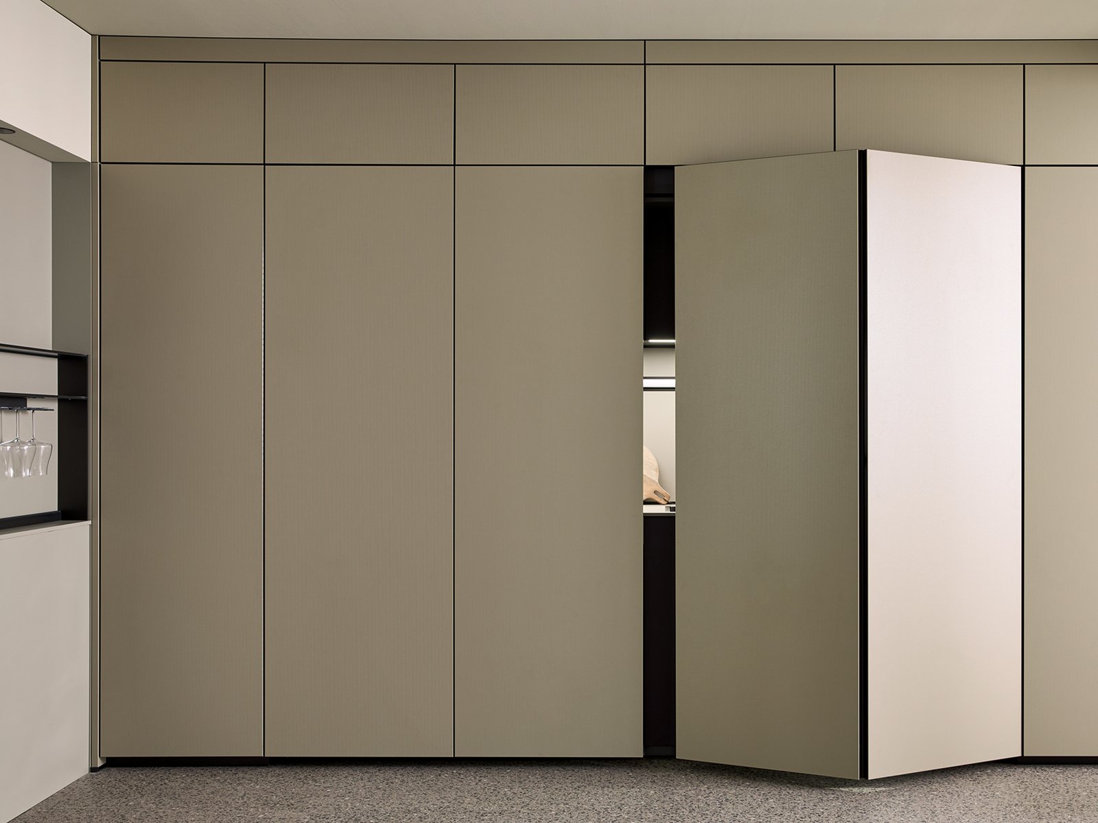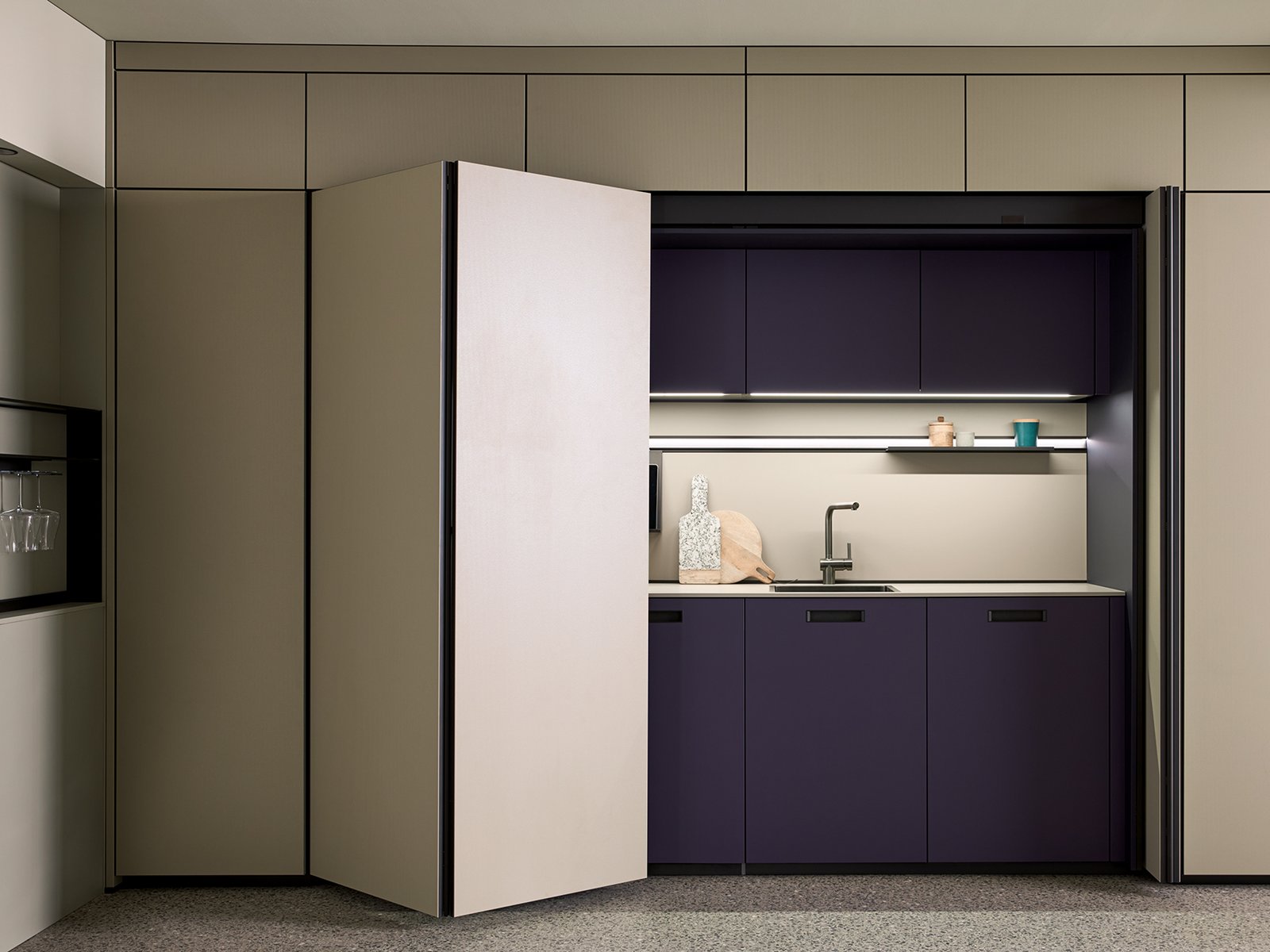 Fermé, l’armoire Pocket reste élégamment en retrait et vient souligner les formes de la table de cuisson next125. Une fois ouvert, les deux éléments fusionnent pour former un ensemble alliant design et fonctionnalité.