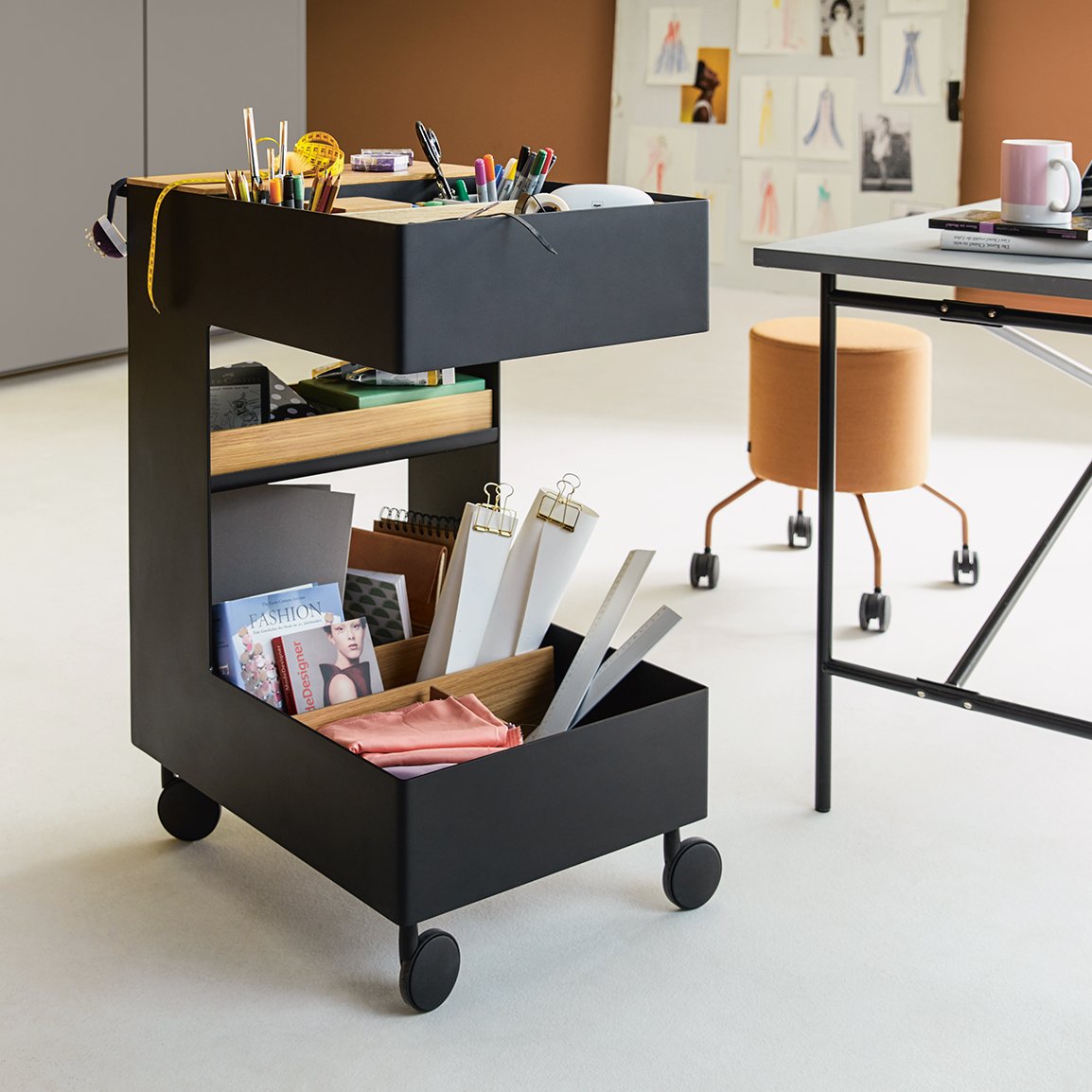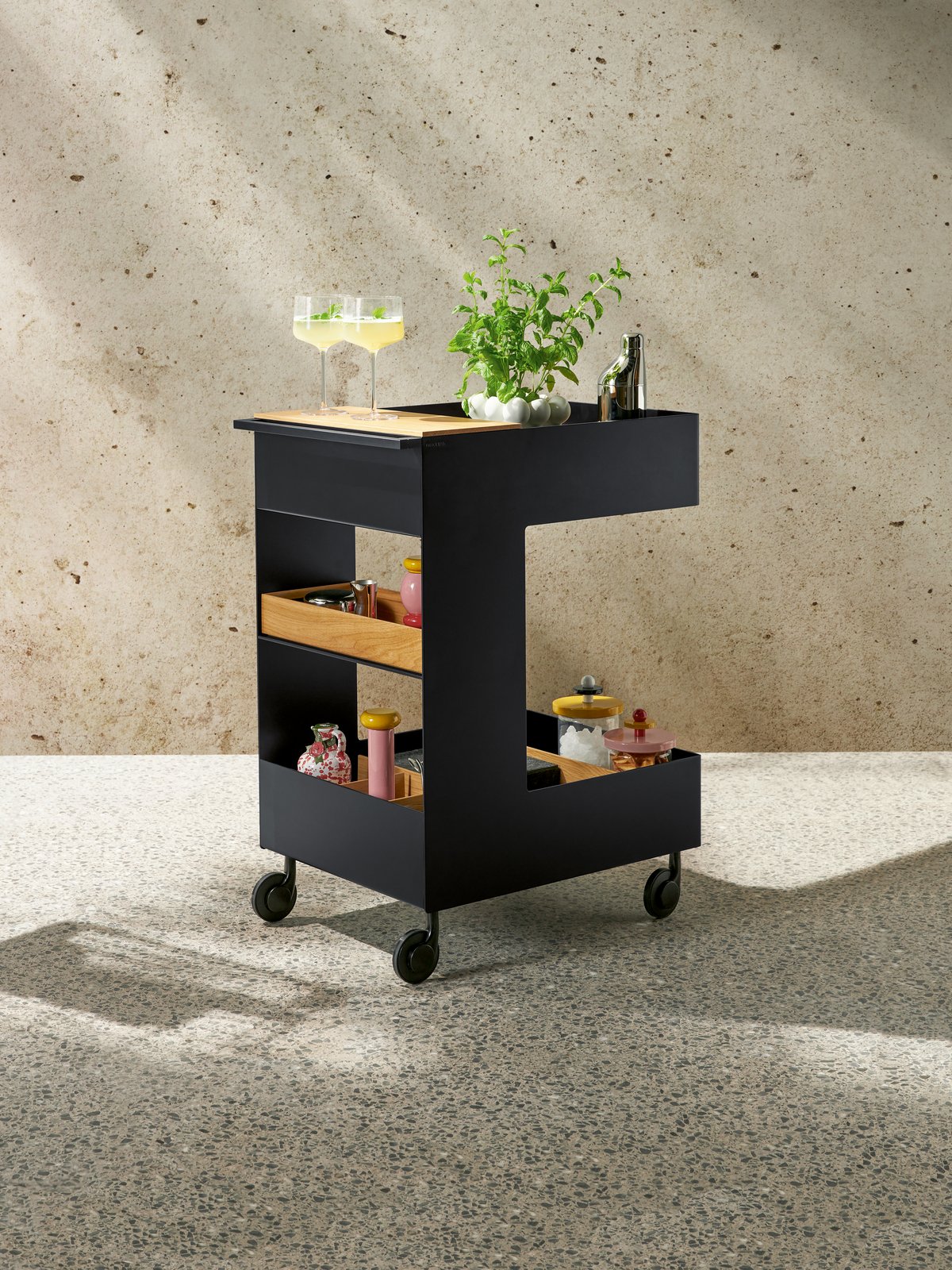 Avec son châssis en aluminium conçu d’un seul bloc, le Trolley s’épanouit comme espace de rangement mobile pour le télétravail ou les travaux créatifs du soir mais aussi comme bar élégant pour les soirées conviviales.
