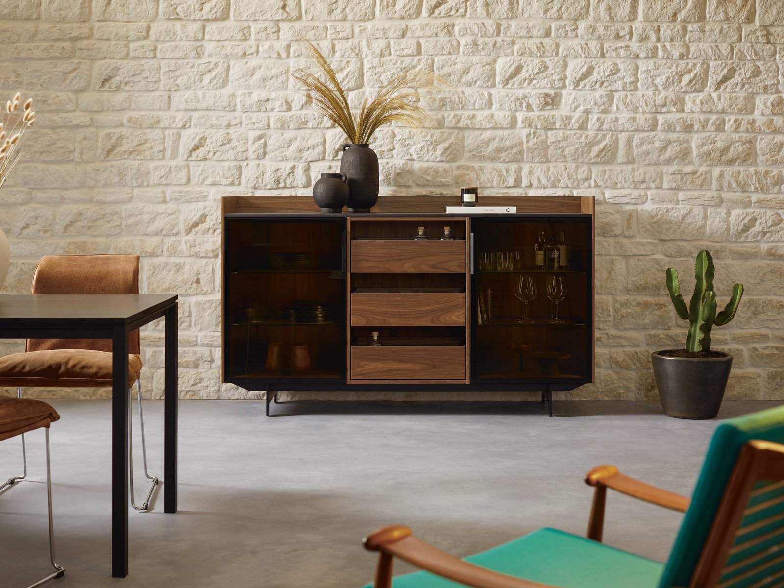 Avec ce meuble next125, vous pouvez relier avec style la cuisine et le salon grâce à un choix de matériaux cohérent ou mettre délibérément en valeur le buffet bas, grâce à des éléments en bois tels que les coulissants anglais ou les portes vitrées rétroéclairées. Tout comme le Trolley, il s’intègre également parfaitement à votre cuisine ou à votre salon, même a posteriori.