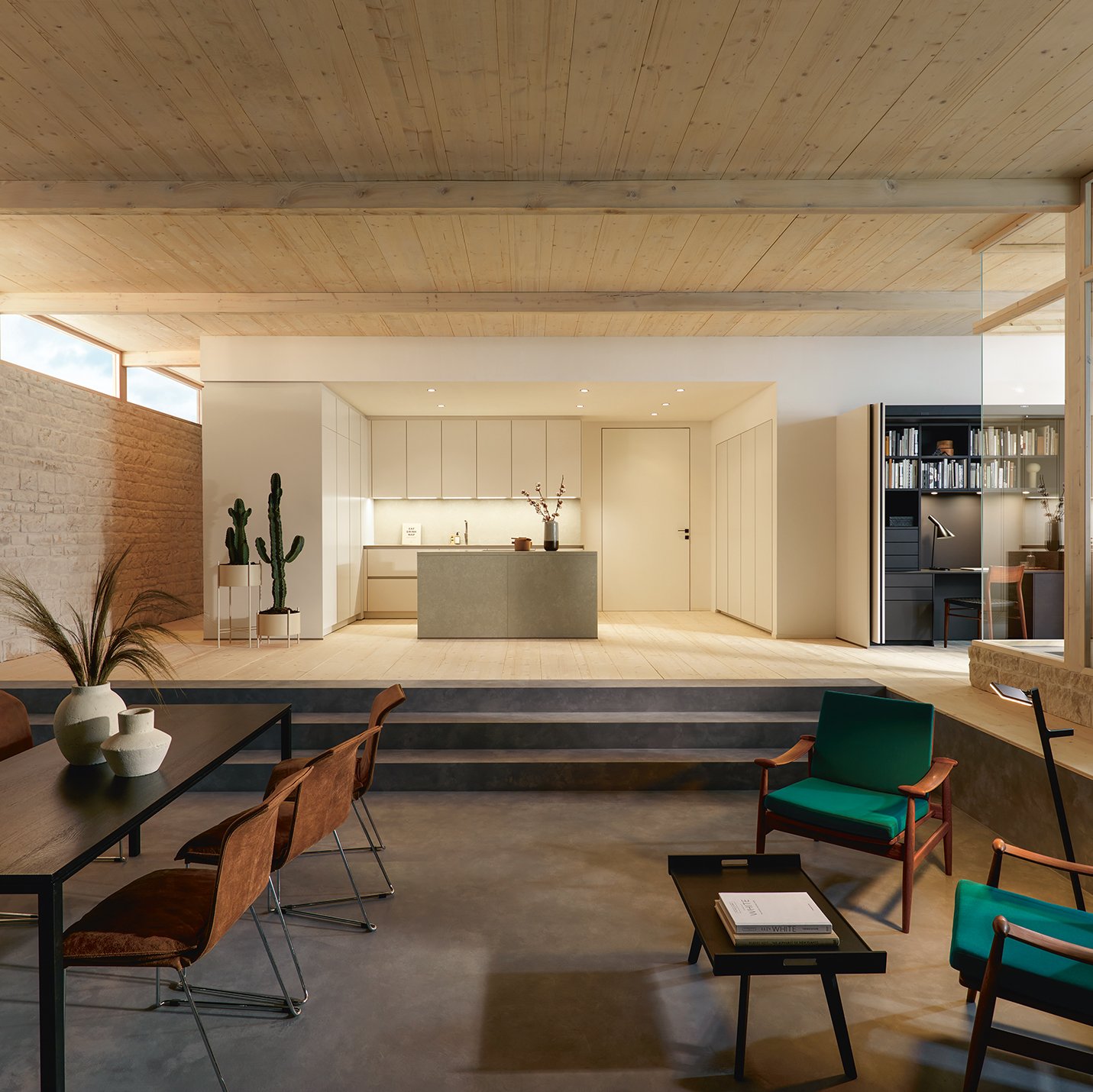 Associée à un Pocketsystem dans la cuisine linéaire située derrière, l’îlot central de cuisson fait forte impression. Ces deux meubles phares se complètent harmonieusement.