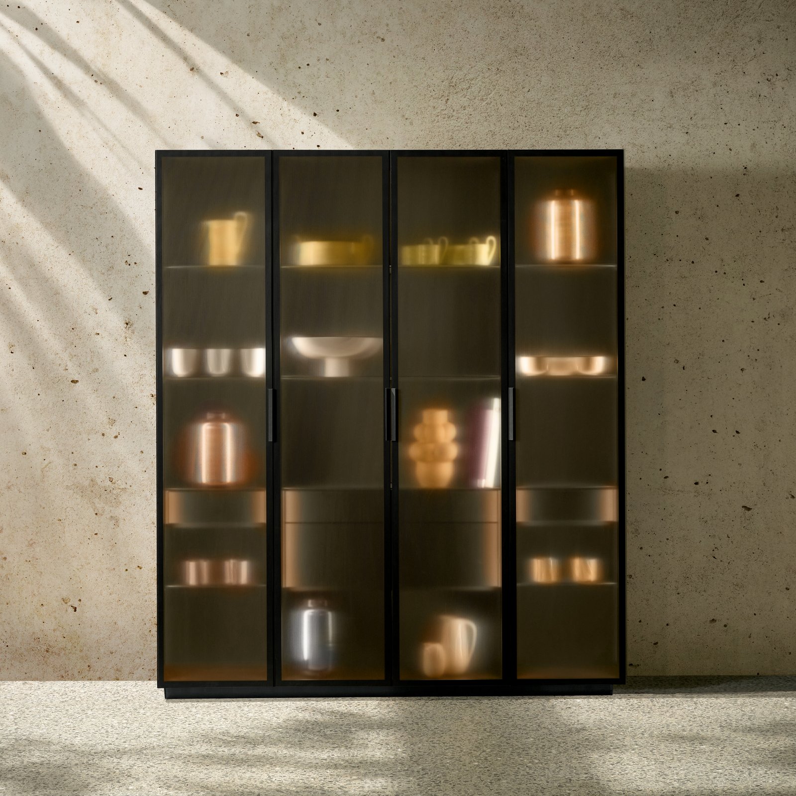 La vedette dans n'importe quelle pièces : dans la cuisine ou le salon, la vitrine next125 est une véritable vedette : elle offre non seulement de l'espace de rangement pour les assiettes, tasses et plats. Elle devient aussi une armoire pour vos trésors particuliers.La vitrine est sciemment conçue en filigrane avec un cadre délicat et des vitres frontales teintées foncées ainsi qu’une poignée extravagante en cuir.