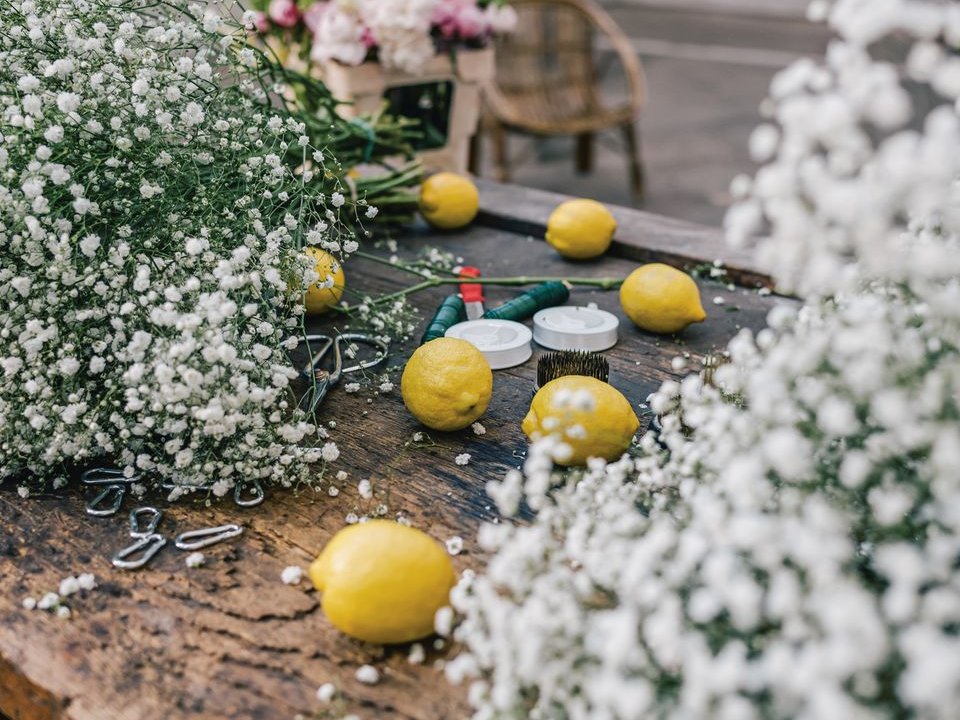 L’artiste florale Valentina Teinitzer vient ajouter deux ingrédients à ce mélange, à savoir les gypsophiles et les agrumes, et s’inspire des techniques de l’art floral japonais appelé « ikebana » pour créer un vaste nuage qui vient couvrir la source de lumière au plafond.