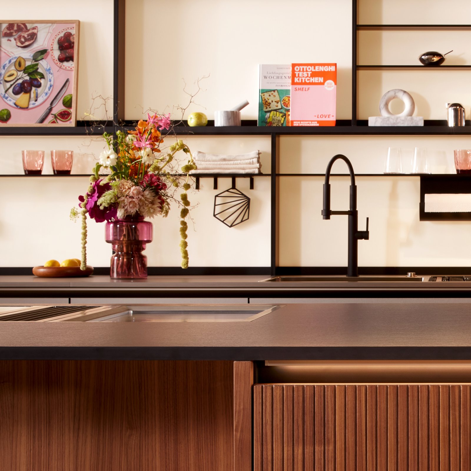 Leonie Pauls ensceneert vakkundig de verschillende decoratieve elementen op de verlichte nissenregaal boven het werkblad. Kookboeken, een foto met een houten lijst en stijlvolle glazen verwijzen steeds weer naar de kleuren rood en roze, die een harmonieuze dialoog voeren met de koele uitstraling van het werkblad van SensiQ Inox met edelstaallook. In combinatie met het bloemenarrangement ontstaat zo een sfeervol stilleven met contrasterende indrukken. Zelfs alledaagse voorwerpen zoals hakmessen, vijzels of stoffen servetten worden blikvangers.