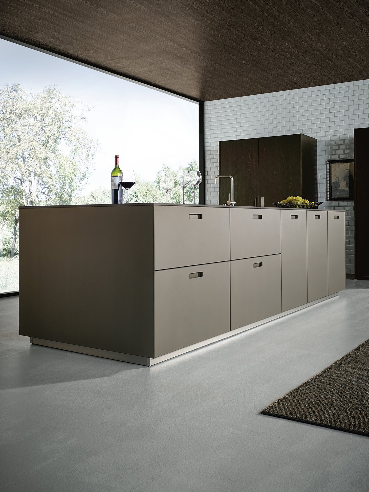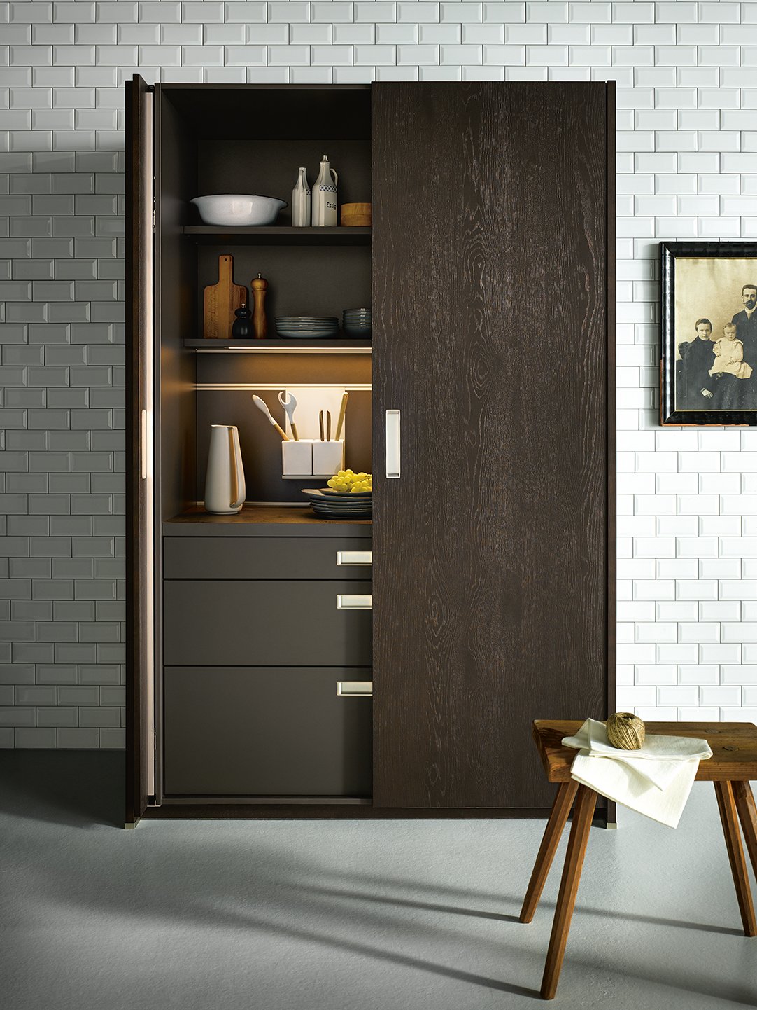 Het kookeiland in mat glas platina metallic is gecentreerd ten opzichte van de twee hoge kasten met inschuifdeuren. Het matte kleurenspel van de glazen fronten vormt een speels contrast met het ruwe, donkere oppervlak van het knoestige eikenhout. Dankzij de lage sokkelhoogte van slechts 5 cm krijgt het eilandblok het karakter van een Sideboard en oogt het meer als een woonmeubel dan als een keukenmeubel. De twee hoge kasten – waarachter zich opbergruimte en plaats voor elektrische apparaten bevinden – dragen eveneens bij aan de huiselijke sfeer.