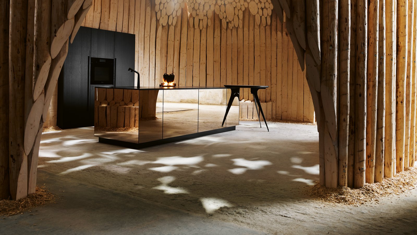 next125 gebruikt onder andere het oppervlaktemateriaal natursteen van Systemo, een natuurlijk materiaal met een uniek uiterlijk en uitzonderlijke materiaaleigenschappen. De kubusvormige helderheid van de keuken, een centraal kenmerk van het merk next125, vormt een maximaal contrast met het natuurpaviljoen van Kéré. Voor het keukenblok dat in het paviljoen van Kéré wordt gepresenteerd, heeft het team van Pfister bewust gekozen voor een bronskleurig spiegelglasoppervlak. Spiegelglas is hier het perfecte materiaal - het oppervlak lost de afmetingen van de keuken visueel enigszins op en laat hem opgaan in zijn omgeving.