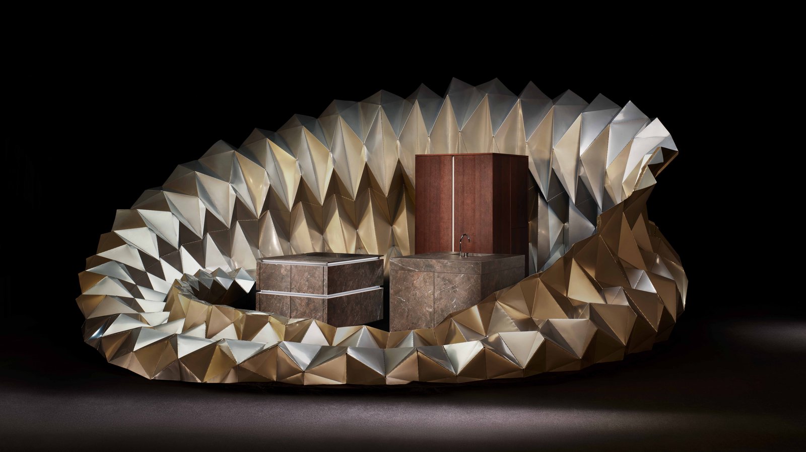 De spectaculaire aluminiumstructuur van Ankon Mitra 'omarmt' de keuken van next125, terwijl het reflecterende materiaal door een voortdurend spel van licht en schaduw constant in beweging lijkt te zijn. Zo ontstaat een dynamische dialoog tussen de organisch gevouwen architectuur en de puristische helderheid van de keukenblokken.